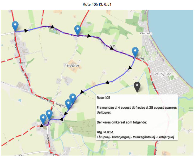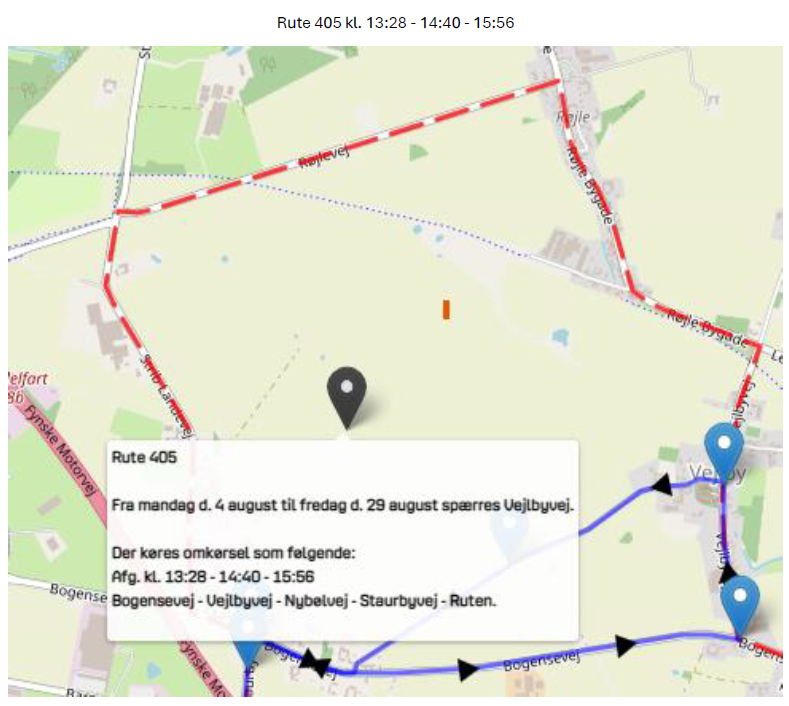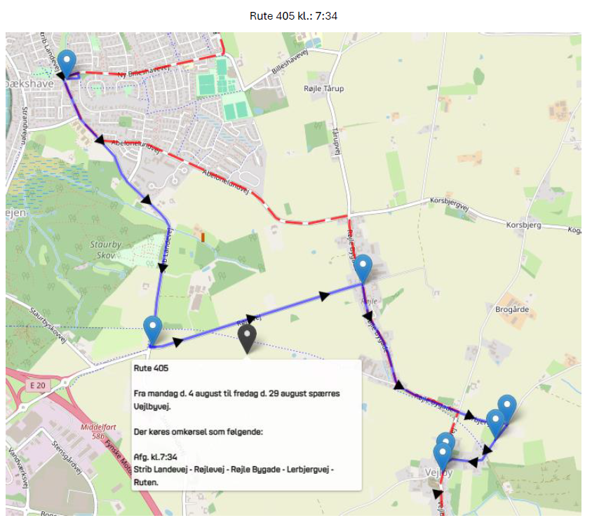 Rute 405 Fra mandag d. 4 august til fredag d. 29 august spærres Vejlbyvej. Der køres omkørsel som følgende: Afg. kl.6:51 Tårupvej – Korsbjergvej – Munkegårdsvej – Lerbjergvej – Nybølvej – Bogensevej – Billeshavevej – Strib Landevej – Ny Billeshavevej – Brændeskovvej – Røjlemosevej. Afg. kl.7:34 Strib Landevej – Røjlevej – Røjle Bygade – Lerbjergvej – Ruten. Afg. kl. 13:28 – 14:40 – 15:56 Bogensevej – Vejlbyvej – Nybølvej – Staurbyvej – Ruten.Fra: 04.08.2025 00.00.00